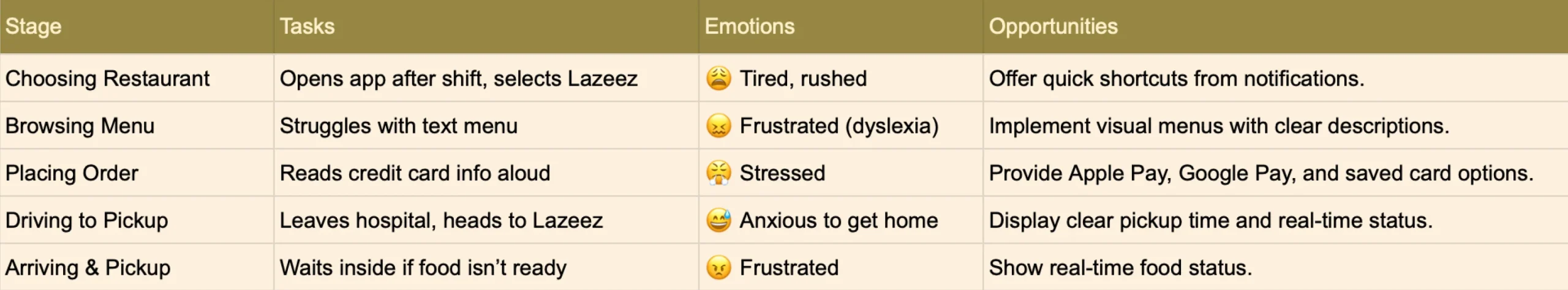 To truly empathize with our users, we mapped Fatima’s typical evening journey when ordering from Lazeez. This exercise revealed critical emotional highs and lows, and pinpointed opportunities for design intervention that directly informed our app’s features.